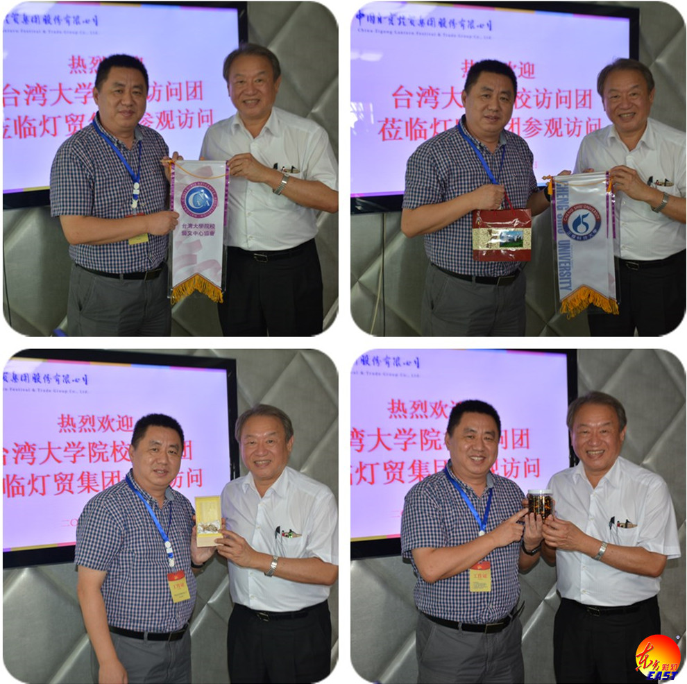 8月5日下午,臺灣地區大學院校藝文中心協會訪問團一行24人在文化部港澳臺辦公室臺灣處處長何婕、省文化廳外聯處處長任丘、市文廣新局副局長江波等領導的陪同下,走進燈貿集團,近距離感受彩燈文化。燈貿集團公司執行總裁陶建軍、集團公司旗下國韻燈貿公司總經理李斌參加了此次交流座談。