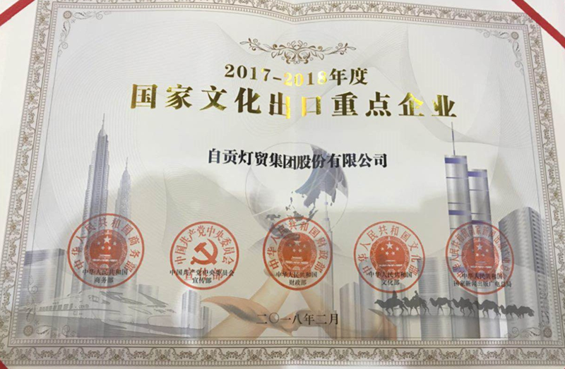 7月26日,四川省“國家文化出口重點企業”授牌儀式在省商務廳三樓會議室隆重舉行,自貢燈貿集團股份有限公司再次入選“2017-2018年度國家文化出口重點企業”,是全國唯一連續六屆十二年獲此殊榮的彩燈企業。