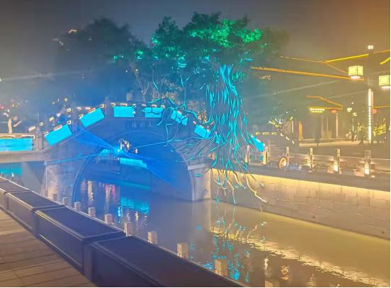 燈貿集團承制的“鹽鎮水街最鹽城”系列彩燈,令游客領略到“夜色闌珊迷人,漿身燈影悠然”的和諧美好繁華景致。華燈搖曳,游人如織,移步天水橋,紡著潺潺夜色,一式的明清風味的青磚黛瓦樓閣,夜幕下燈火璀璨。